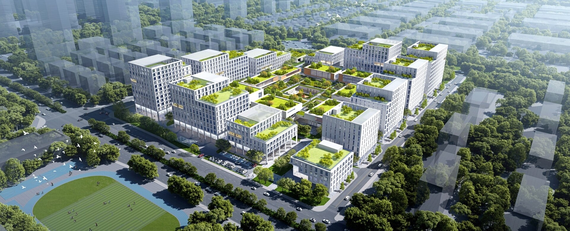 园区内部以产业集聚效应为载体,集成生产研发、会议、展示、餐饮、活力运动、休闲公园等多种业态,打造生产、生活、生态为一体的“三生融合”现代化产业园。园区采用双 L 围合退台式布局,建筑群高度从20m到50m,创造极具特色的天际线,形成多层次会呼吸的生态花园。